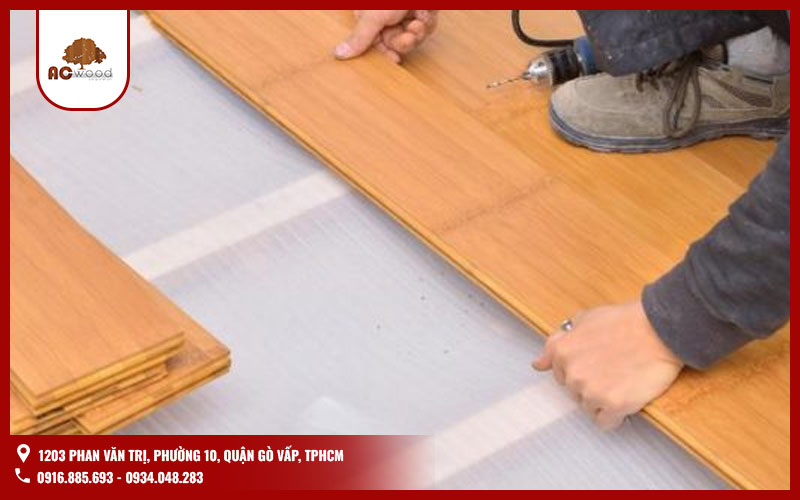 • Sử dụng vít và máy khoan để cố định khung gỗ vào nền sàn, đảm bảo khung không di chuyển trong quá trình sử dụng.